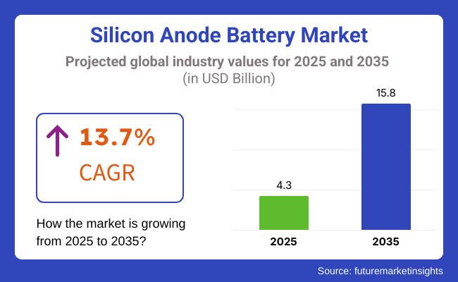 According to the latest analysis by Future Market Insights, the global silicon anode battery market is entering a transformative growth phase, fueled by accelerating demand for high-energy-density storage across electric vehicles (EVs), consumer electronics, and renewable energy systems. With a projected market size of USD 4.3 billion in 2025, the industry is expected to surge to USD 15.8 billion by 2035, expanding at a CAGR of 13.7%.