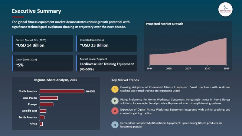 Wilmington, DE, USA, April 24, 2026 - According to MarketGenics Global Research, the global fitness equipment market is valued at USD 14.2 billion in 2025 and is projected to reach USD 22.5 billion by 2035, expanding at a CAGR of 4.7% during the forecast period.