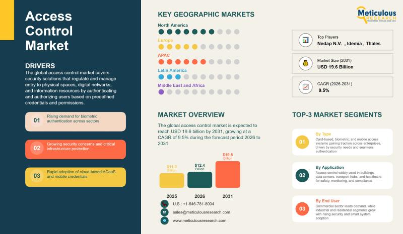 The global access control market is experiencing strong growth as organizations worldwide increase investments in physical and digital security systems. The market was valued at USD 12.4 billion in 2026 and is projected to reach USD 19.6 billion by 2031, expanding at a CAGR of 9.5% during the forecast period. Rising concerns around unauthorized access, workplace safety, data protection, and critical infrastructure security…