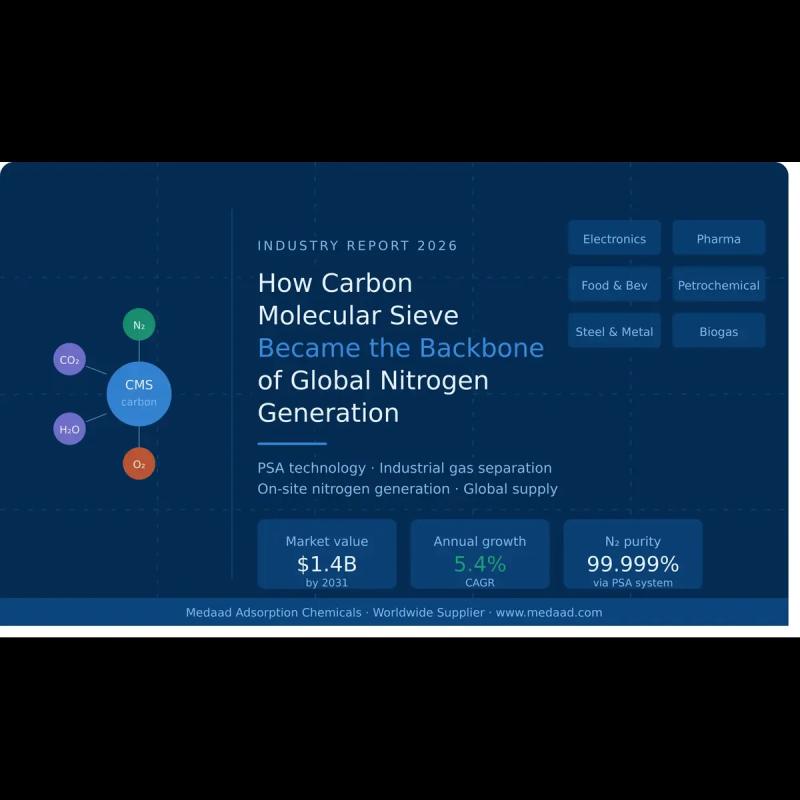The global Carbon Molecular Sieves market was valued at $0.9 billion in 2021 and is projected to reach $1.4 billion by 2031, growing at a CAGR of 5.4%. A separate market analysis projects the CMS segment for nitrogen generation alone to exceed $2 billion by 2030, driven by robust growth across electronics, pharmaceuticals, food processing, and chemical industries.