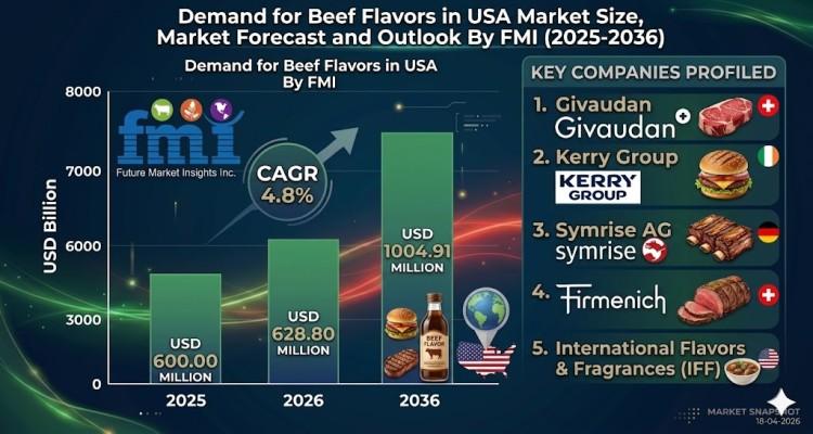 NEWARK, Del., USA | April 23, 2026 According to Future Market Insights (FMI), the demand for beef flavors in the USA is projected to grow from USD 628.80 million in 2026 to USD 1,004.91 million by 2036, registering a CAGR of 4.8%. Growth is being driven by clean-label reformulation trends, rising demand from foodservice channels, and expanding applications in processed foods and alternative proteins.