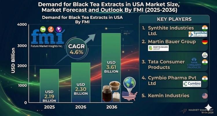 NEWARK, Del., USA | April 23, 2026 According to Future Market Insights (FMI), the demand for black tea extracts in the USA is projected to grow from USD 2.30 billion in 2026 to USD 3.61 billion by 2036, registering a CAGR of 4.6%. Growth is being driven by rising adoption in functional beverages, increasing use in dietary supplements, and expanding applications in personal care formulations.