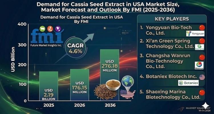 NEWARK, Del., USA | April 23, 2026 According to Future Market Insights (FMI), the demand for cassia seed extract in the USA market is projected to grow from USD 176.15 million in 2026 to USD 276.18 million by 2036, registering a CAGR of 4.6%. Growth is being driven by rising demand for plant-based nutraceutical ingredients, expanding wellness trends, and increasing preference for natural formulations across health, food, and cosmetic…