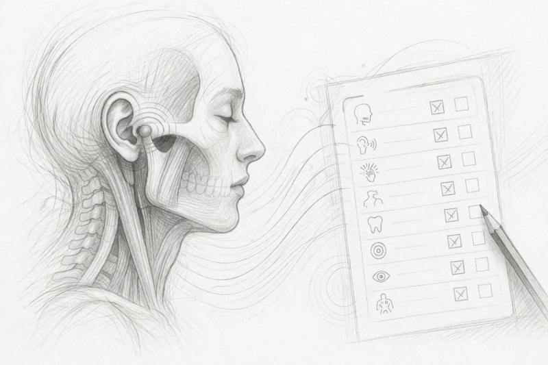 A typical feature of TMD is that symptoms occur not only in the jaw but also in the head, neck, or even the ear area. If you experience several symptoms simultaneously or in rotation--such as jaw tension, headaches, and neck problems--this may indicate functional connections. The key point here is not a single symptom, but the combination and the overall picture.