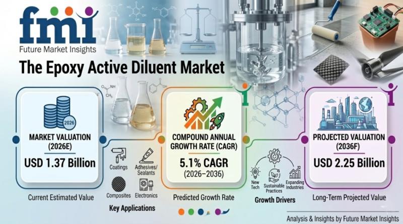 According to the latest analysis by Future Market Insights, the global epoxy active diluent market is transitioning from a supporting chemical segment into a critical component of high-performance material systems. As industries increasingly prioritize compliance, efficiency, and durability, epoxy active diluents are emerging as essential inputs across coatings, adhesives, composites, and advanced manufacturing applications. The market is projected to grow from USD 1.37 billion in 2026 to USD 2.25 billion…