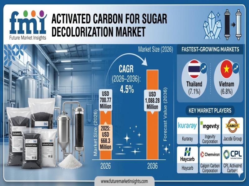 The global activated carbon for sugar decolorization market is entering a steady-growth phase as sugar processors increasingly prioritize high-purity output and compliance with stringent food-grade standards. According to the latest analysis, the market is valued at USD 700.77 million in 2026 and is projected to reach USD 1,088.28 million by 2036, expanding at a CAGR of 4.5%. The sector is expected to generate an incremental opportunity of USD 387.50 million over the forecast period.This growth reflects a structural evolution in sugar refining processes, where activated carbon plays a critical role in removing color bodies, polyphenols, and impurities from sucrose, glucose, and fructose syrups to meet ICUMSA color standards and premium product specifications.