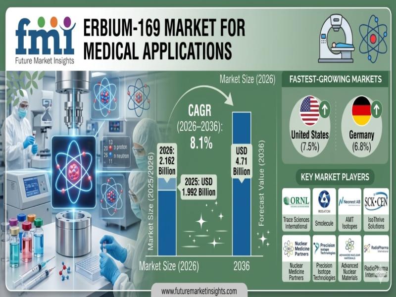 The global erbium-169 market is entering a strong growth phase as nuclear medicine adoption accelerates worldwide. According to the latest analysis, the market is valued at USD 2.162 billion in 2026 and is projected to reach USD 4.71 billion by 2036, expanding at a CAGR of 8.1%. The sector is expected to generate an incremental opportunity of USD 2.55 billion over the forecast period.