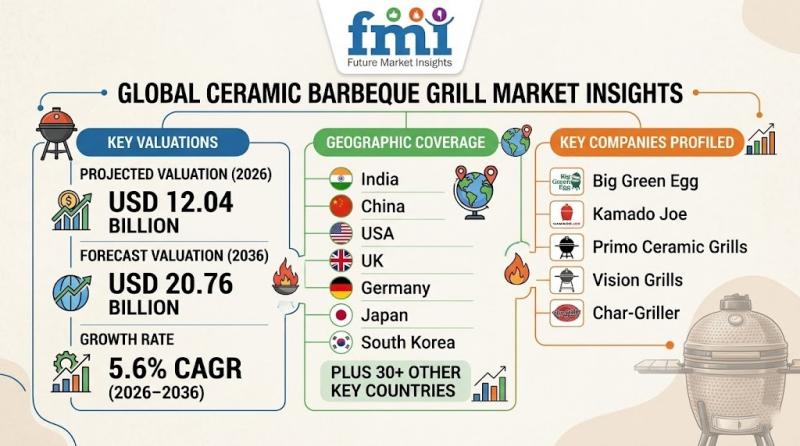 According to the latest analysis by Future Market Insights (FMI), the global ceramic barbeque grill market is evolving into a premium, lifestyle-driven category, fueled by the rapid expansion of kamado cooking culture, outdoor kitchen integration, and rising demand for versatile charcoal-based cooking solutions. The market is projected to grow from USD 12.04 billion in 2026 to USD 20.76 billion by 2036, registering a CAGR of 5.6% during the forecast period.