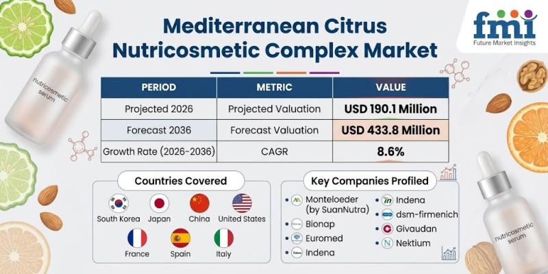 According to the latest analysis by Future Market Insights (FMI), the global Mediterranean citrus nutricosmetic complex market is transitioning into a clinically validated, ingredient-driven category, fueled by rising demand for ingestible beauty solutions and scientifically backed botanical formulations. The market is projected to grow from USD 190.1 million in 2026 to USD 433.8 million by 2036, registering a CAGR of 8.6% during the forecast period.