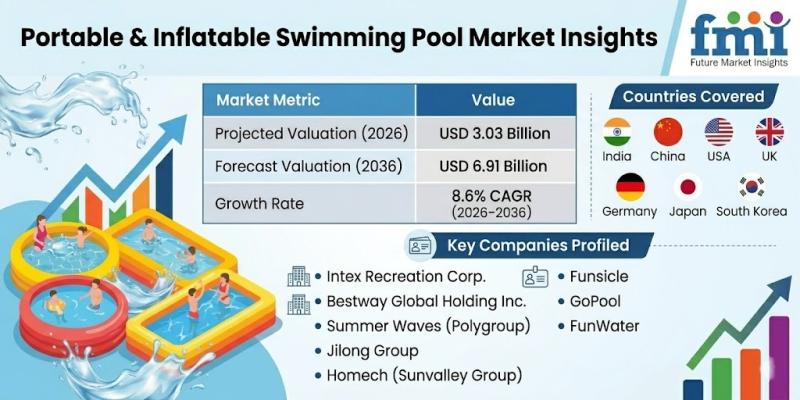 According to the latest analysis by Future Market Insights (FMI), the global portable & inflatable swimming pool market is evolving into a high-growth, lifestyle-driven category, fueled by rising suburban home recreation investments, seasonal e-commerce demand, and advancements in durable pool materials. The market is projected to grow from USD 3.03 billion in 2026 to USD 6.91 billion by 2036, registering a CAGR of 8.6% during the forecast period.