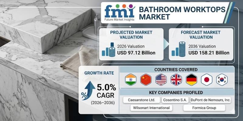 According to the latest analysis by Future Market Insights (FMI), the global bathroom worktops market is evolving into a design-driven, material-innovation-focused category, supported by rising residential renovation activity and growing preference for premium interior finishes. The market is projected to grow from USD 97.12 billion in 2026 to USD 158.21 billion by 2036, registering a CAGR of 5.0% during the forecast period.