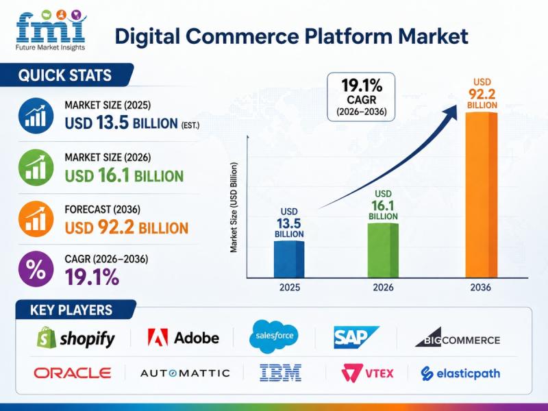 The global digital commerce platform market is entering a hyper-growth phase as enterprises transition from channel-centric ecommerce architectures to platform-centric operating models. According to the latest analysis, the market is valued at USD 16.1 billion in 2026 and is projected to reach USD 92.2 billion by 2036, expanding at a CAGR of 19.1%. The sector is expected to generate an incremental opportunity of USD 76.1 billion over the forecast period.