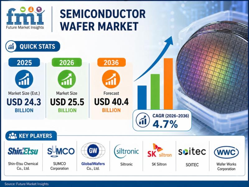 The global semiconductor wafer market is entering a structurally transformative growth phase, fueled by accelerating demand for AI chips, advanced computing, and large-scale foundry investments. According to the latest analysis, the market is valued at USD 25.5 billion in 2026 and is projected to reach USD 40.4 billion by 2036, expanding at a CAGR of 4.7%. The sector is poised to generate an incremental opportunity of USD 14.9 billion over the forecast period.This expansion is being driven by a powerful convergence of factors-AI accelerator demand, aggressive foundry CAPEX cycles, and global semiconductor reshoring initiatives. As leading chipmakers ramp up investments in advanced nodes, semiconductor wafers-particularly 300mm-are becoming the critical foundation enabling next-generation computing performance.