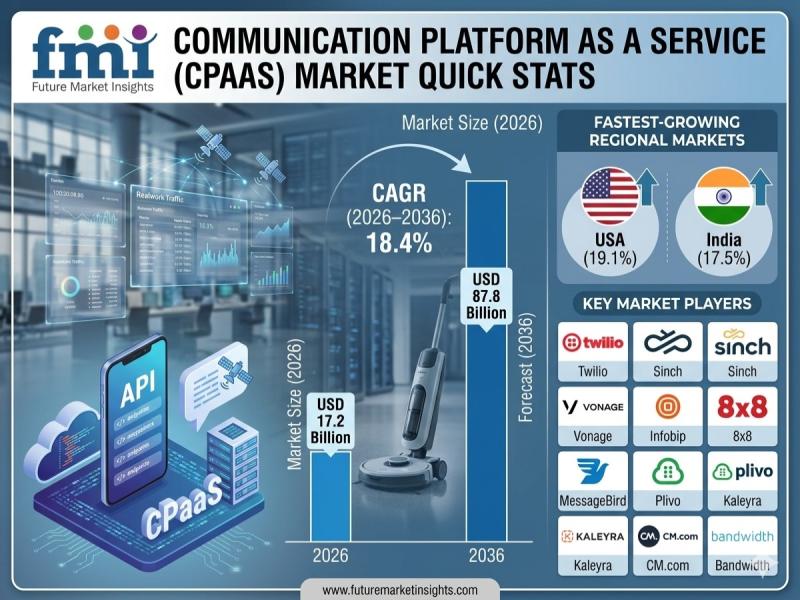 The global Communication Platform as a Service (CPaaS) market is entering a hyper-growth phase as enterprises accelerate the integration of voice, messaging, and video into digital applications and customer engagement workflows. Valued at USD 17.2 billion in 2026, the market is projected to reach USD 87.8 billion by 2036, expanding at a robust CAGR of 18.4%.