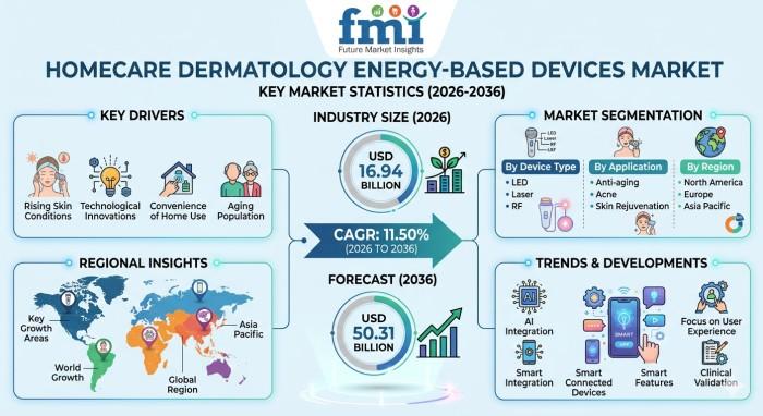 NEWARK, Del., USA | April 27, 2026 / According to latest insights by Future Market Insights, the global homecare dermatology energy-based devices market is entering a high-growth phase as consumers increasingly shift toward at-home aesthetic treatments. According to the latest analysis, the market is valued at USD 16.94 billion in 2026 and is projected to reach USD 50.31 billion by 2036, expanding at a CAGR of 11.50%. The sector is…