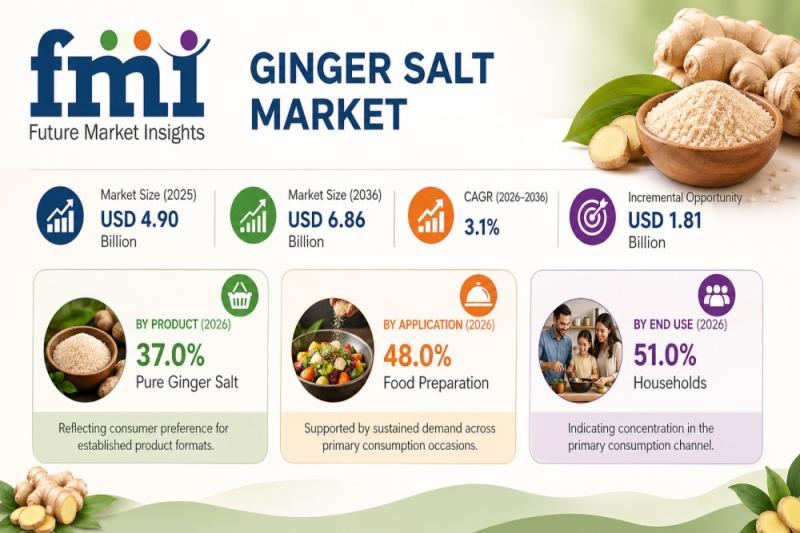 The global ginger salt market is witnessing steady expansion as consumers increasingly shift toward functional and health-enhancing seasoning alternatives. According to the latest analysis, the market is valued at USD 5.05 billion in 2026 and is projected to reach USD 6.86 billion by 2036, expanding at a CAGR of 3.1%. The sector is expected to generate an incremental opportunity of USD 1.81 billion over the forecast period.This growth reflects a structural shift in consumer preferences, where ginger-infused salt is transitioning from a niche product into a mainstream pantry essential. Rising awareness of ginger's anti-inflammatory and digestive benefits, combined with increasing demand for clean-label and natural ingredients, is accelerating adoption across both household and foodservice segments.