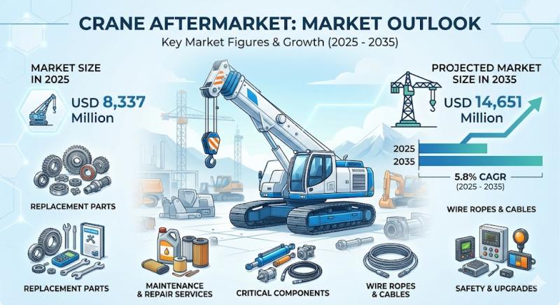 According to the latest analysis by Future Market Insights, the global crane aftermarket is undergoing a structural transformation as industries increasingly prioritize equipment uptime, safety, and lifecycle optimization. Driven by rising demand for maintenance, spare parts, and refurbishment services across construction, mining, oil & gas, and logistics sectors, the crane aftermarket is emerging as a critical pillar of industrial efficiency.The market is projected to grow from USD 8,337 Million in 2025 to USD 14,651 Million by 2035, expanding at a CAGR of 5.8% during the forecast period. This growth is fueled by rapid adoption of predictive maintenance technologies, digital diagnostics, and remote monitoring systems.