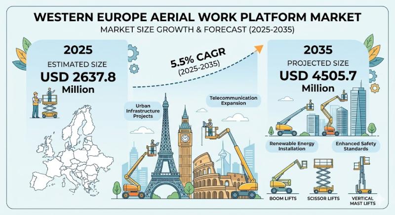 According to the latest analysis by Future Market Insights, the Western Europe Aerial Work Platform (AWP) market is entering a transformative growth phase, projected to expand from USD 2.63 billion in 2025 to USD 4.5 billion by 2035, registering a steady 5.5% CAGR. This growth reflects a powerful convergence of urbanization, infrastructure modernization, sustainability mandates, and digital innovation.From construction sites to warehouse operations, AWPs are becoming indispensable for safe, efficient, and elevated access. The shift toward automation, electrification, and rental-based procurement models is fundamentally redefining how businesses deploy these platforms.