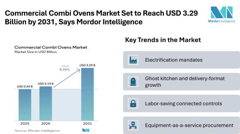 According to Mordor Intelligence, the global commercial combi ovens market size [https://www.mordorintelligence.com/industry-reports/commercial-combi-ovens-market?utm_source=abnewswire] is valued at USD 2.14 billion in 2026 and projected to reach USD 3.29 billion by 2031, registering a CAGR of 8.98%. This growth reflects a broad shift in how foodservice…