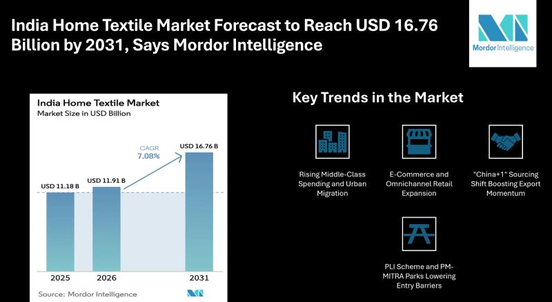 According to Mordor Intelligence, the India home textile market size was valued at USD 11.18 billion in 2025 and is projected to grow from USD 11.91 billion in 2026 to USD 16.76 billion by 2031, registering a CAGR of 7.08% during…