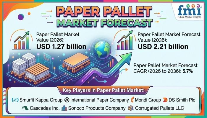 According to the latest market analysis by Future Market Insights, the paper pallet market is entering a structured growth phase as global supply chains transition toward lightweight, recyclable, and regulation-compliant logistics platforms. The market is valued at USD 1.27 billion in 2026 and is projected to reach USD 2.21 billion by 2036, expanding at a CAGR of 5.7%. The sector is expected to generate an incremental opportunity of USD 0.94 billion over the forecast period.This growth reflects a fundamental shift in procurement strategies, where logistics efficiency, phytosanitary compliance, and freight cost optimization are driving the replacement of traditional wood pallets with paper-based alternatives across international shipping and industrial distribution systems.