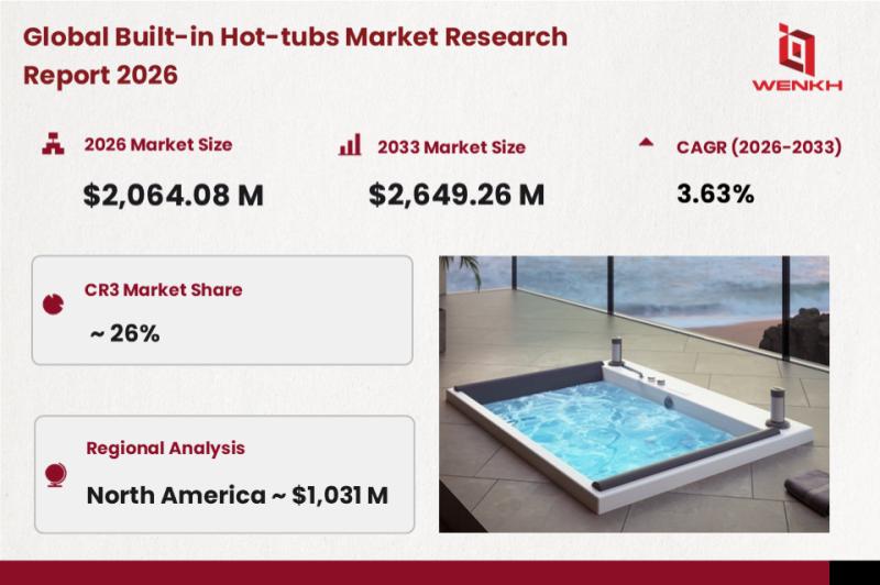 According to WENKH research statistics, the Built-in Hot-tubs market size is set to climb from $2,064.08 million in 2026 to $2,649.26 million by 2033, achieving a compound annual growth rate (CAGR) of around 3.63%. Driven primarily by the growing consumer demand for home health and quality living, the global Built-in Hot-tubs market is seeing steady expansion. Consumers' increasing need for stress relief and improved physical well-being continues to rise, with a growing focus on home wellness and leisure spaces. Built-in hot tubs cater to the upgrade needs of high-end residences and outdoor areas, perfectly aligning with the expanding demand for premium home experiences. This shift toward more luxurious and wellness-oriented living spaces is driving the steady market growth, further supported by the rising interest in at-home relaxation and self-care routines.