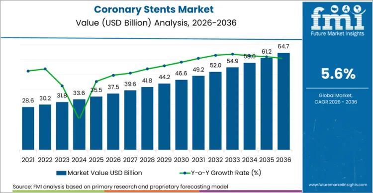 The global coronary stents market is set for steady expansion, rising from USD 37.5 billion in 2026 to USD 64.6 billion by 2036, reflecting a compound annual growth rate (CAGR) of 5.6%. Future Market Insights highlights that this trajectory is driven by the enduring worldwide prevalence of coronary artery disease and ongoing improvements in percutaneous coronary intervention (PCI) techniques. With cardiovascular diseases continuing as a major global health challenge, demand