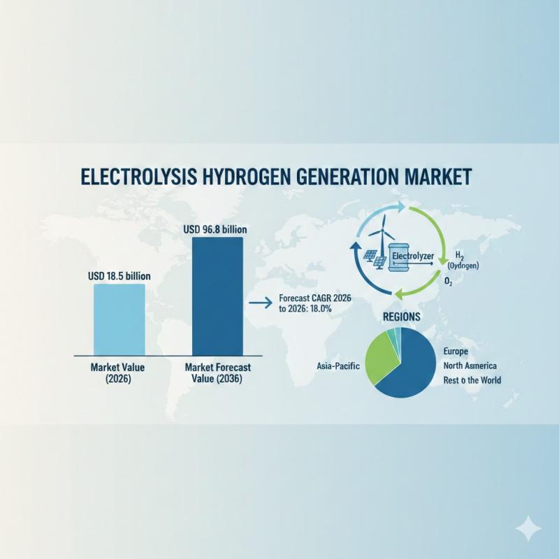 The global Electrolysis Hydrogen Generation Market is projected to grow from USD 18.5 billion in 2026 to USD 96.8 billion by 2036, reflecting a strong CAGR of 18.0% over the forecast period. Market expansion is being shaped by electrolysis emerging as a strategic energy conversion solution-transforming renewable electricity into low-carbon hydrogen for industrial feedstock, grid balancing, and mobility infrastructure.