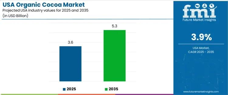 The demand for organic cocoa in the USA is set to expand steadily from USD 3.6 billion in 2025 to USD 5.3 billion by 2035, reflecting a compound annual growth rate (CAGR) of 3.9%. This growth is fueled by increasing consumer preference for organic and sustainably sourced food products, alongside rising awareness of health and environmental concerns.