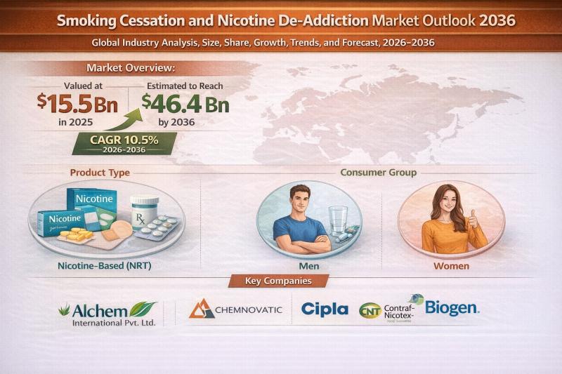The global smoking cessation and nicotine de-addiction market is witnessing strong and sustained growth, fueled by intensifying public health initiatives and rising awareness about the long-term consequences of tobacco use. Valued at USD 15.5 Bn in 2025, the market is projected to expand at a robust CAGR of 10.5% from 2026 to 2036, reaching USD 46.4 Bn by 2036.