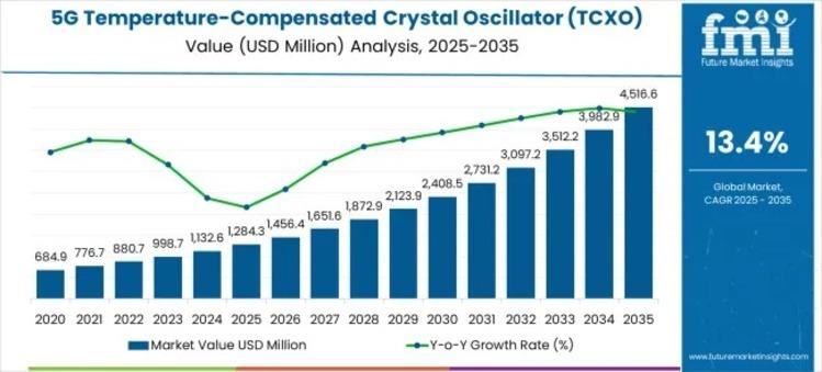 The global 5G Temperature-Compensated Crystal Oscillator (TCXO) Market is poised for strong growth, expanding from USD 1,284.3 million in 2025 to USD 4,516.6 million by 2035, reflecting a compound annual growth rate (CAGR) of 13.4%. The market's acceleration aligns closely with the rapid deployment of global 5G networks and increasing demand for precision timing solutions in communications, automotive electronics, and IoT systems.