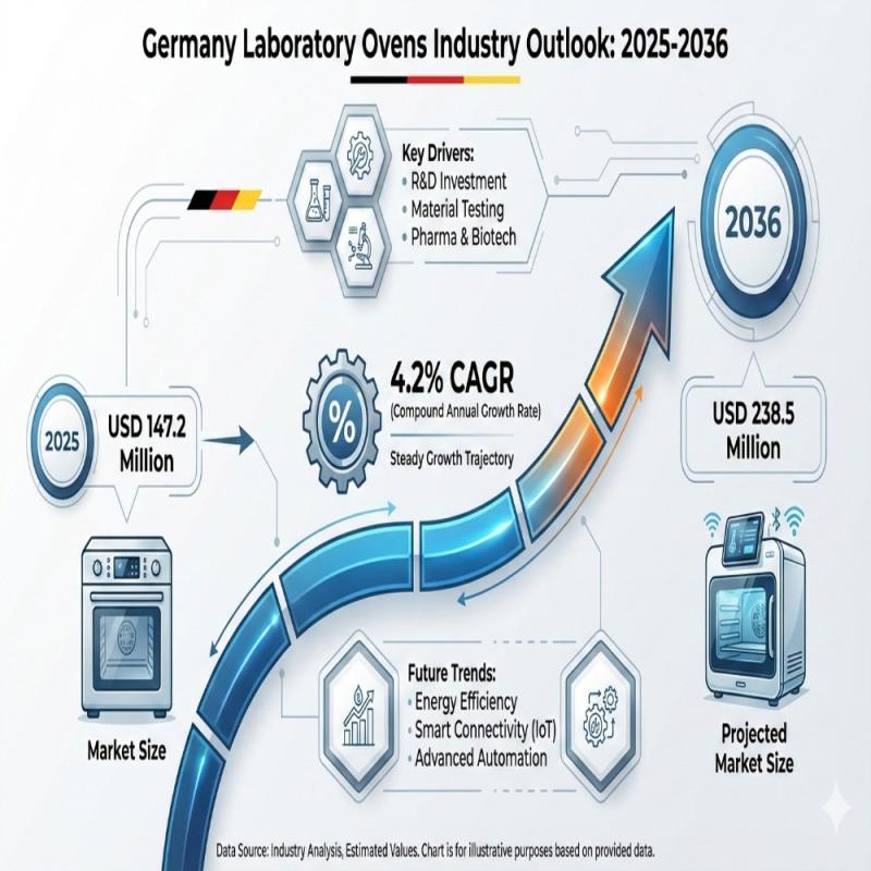 The Germany laboratory ovens industry continues to strengthen its position as the premium segment of the European laboratory equipment market, advancing from USD 147.2 million in 2025 to USD 238.5 million by 2036, expanding at a 4.2% CAGR. This growth reflects Germany's unmatched convergence of engineering excellence, stringent quality standards, and deep integration of Industry 4.0 principles across manufacturing and research ecosystems.