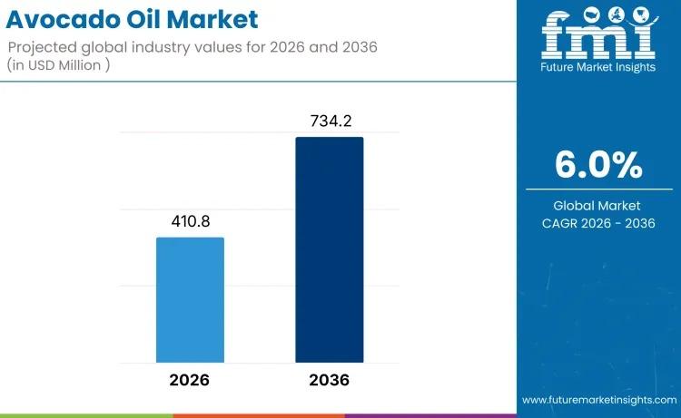 The global avocado oil market is projected to grow from USD 410.8 million in 2026 to USD 734.2 million by 2036, reflecting a robust CAGR of 6.0%. Market growth is fueled by increasing consumer preference for clean-label, nutrient-rich oils, and a surge in adoption by food manufacturers, health-conscious consumers, and cosmetic companies. The versatile oil is gaining traction in both culinary and personal care applications due to its high nutritional