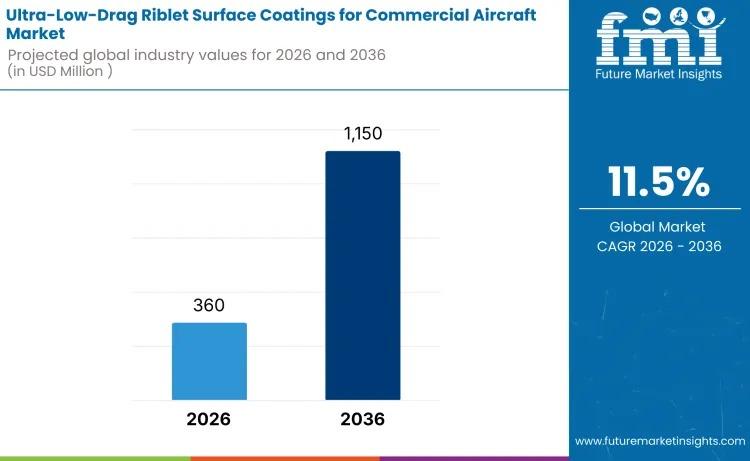 The global market for ultra-low-drag riblet surface coatings for commercial aircraft is set for significant expansion over the next decade. Valued at USD 360 million in 2026, the market is projected to reach USD 1,150 million by 2036, advancing at a robust compound annual growth rate (CAGR) of 11.5%. The growth trajectory is primarily driven by the aviation sector's increasing emphasis on fuel efficiency, environmental sustainability, and operational cost optimization.