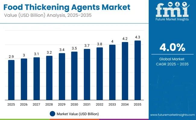 The global food thickening agents market is poised for steady growth, estimated at USD 2.9 billion in 2025 and projected to reach USD 4.3 billion by 2035, registering a CAGR of 4.0%. This growth trajectory reflects an absolute dollar opportunity of USD 1.40 billion over the decade, highlighting a 1.48 times expansion.
