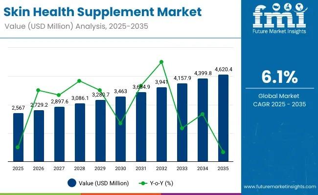 The global skin health supplement market is entering a sustained growth phase as consumers increasingly prioritize holistic skin wellness over topical-only solutions. Valued at USD 2,567 million in 2025, the market is projected to reach USD 4,620.4 million by 2035, expanding at a CAGR of 6.1%. This controlled yet resilient growth reflects the accelerated adoption of beauty-from-within concepts, rising dermatological awareness, and the integration of wellness technology across consumer health,…
