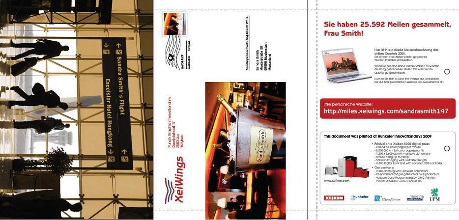 By demonstrating a sophisticated full-color transpromo for an air miles loyalty program offered by a fictitious airline company, XeiWings.com, it will be possible to show how accounts for bonus miles (transactions) are coupled to prizes (promotions). Depending on the miles collected by the customer, the corresponding bonus gifts are illustrated in color – in some cases, these gifts can also be gender-specific, for instance, perfumes for women or special watches for women or men. To make the incentive for flying additional miles more attractive, the next-best top prize is displayed through image personalization. As the number of miles gathered increases, so too does the attractiveness of the prizes – the allure being a weekend stay at a luxury resort on Waikiki Beach. In the case of Waikiki, for instance, it is ideal to portray a surfboard on the beach, personalized with artistic lettering that reads: “Have fun, Peter!” or “Have fun, Frank!”, depending, of course, on the name of the recipient or winner.