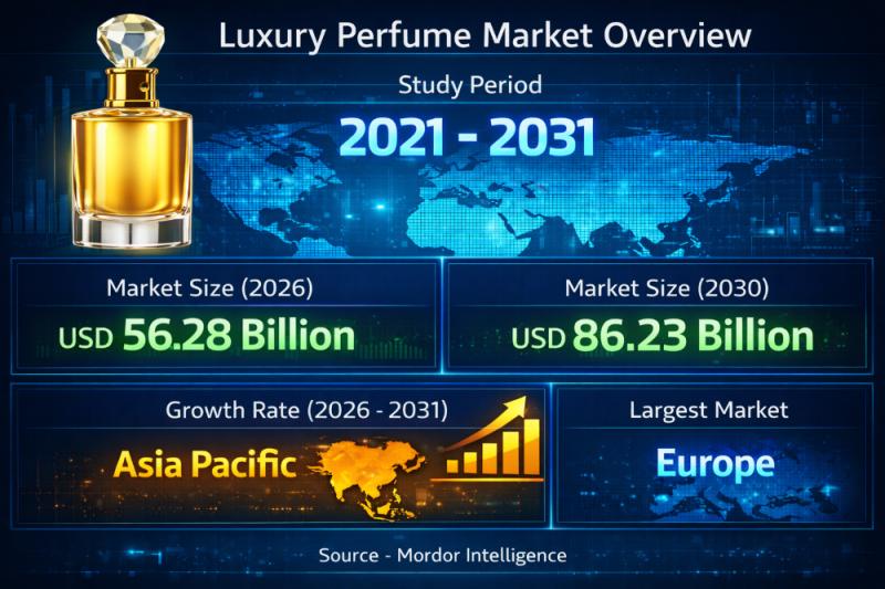 The Luxury Perfume Market is witnessing sustained expansion as fragrances increasingly represent personal identity, emotional expression, and lifestyle positioning. According to Mordor Intelligence, the market size is valued at USD 56.28 billion in 2026 and is projected to reach USD 86.23 billion by 2031, supported by premiumization, evolving consumer preferences, and rising demand across both mature and emerging economies.