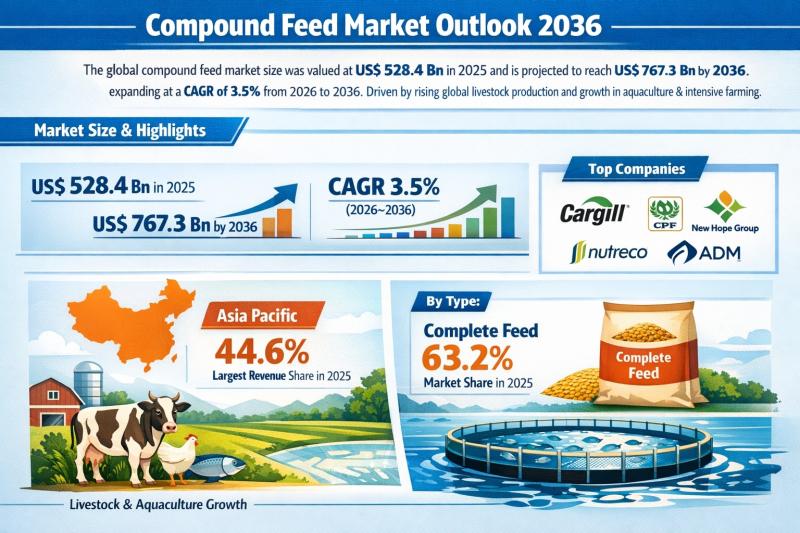 The global compound feed market was valued at US$ 528.4 billion in 2025 and is projected to reach US$ 767.3 billion by 2036, expanding at a steady CAGR of 3.5% from 2026 to 2036. The industry's growth trajectory reflects rising global livestock production, increasing demand for animal protein, and rapid expansion of aquaculture and intensive farming systems worldwide.