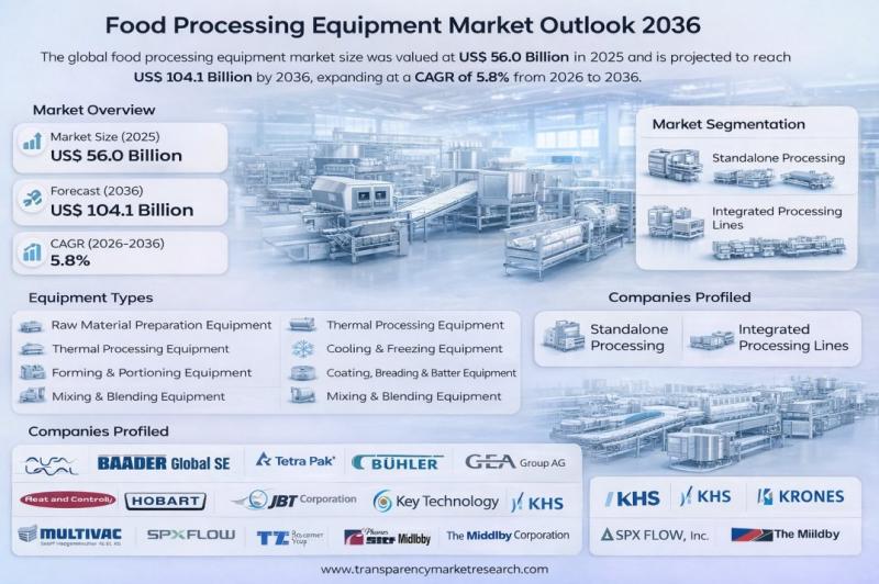 The global food processing equipment market was valued at US$ 56.0 Billion in 2025 and is projected to reach US$ 104.1 Billion by 2036, expanding at a CAGR of 5.8% from 2026 to 2036. Market expansion is being driven by rising demand for processed and convenience foods, expanding urbanization, increasing automation in food manufacturing, stringent food safety regulations, growing meat and dairy consumption, technological advancements, adoption of energy-efficient machinery, industrialization…