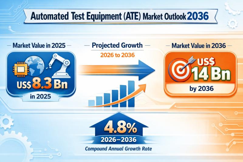 The global Automated Test Equipment (ATE) market is witnessing strong expansion as semiconductor technologies evolve rapidly across automotive, artificial intelligence (AI), consumer electronics, telecommunications, and advanced computing applications. According to industry analysis, the market was valued at US$ 8.3 billion in 2025 and is projected to reach US$ 14 billion by 2036, expanding at a CAGR of 4.8% from 2026 to 2036. Access key findings and insights from our Report in
