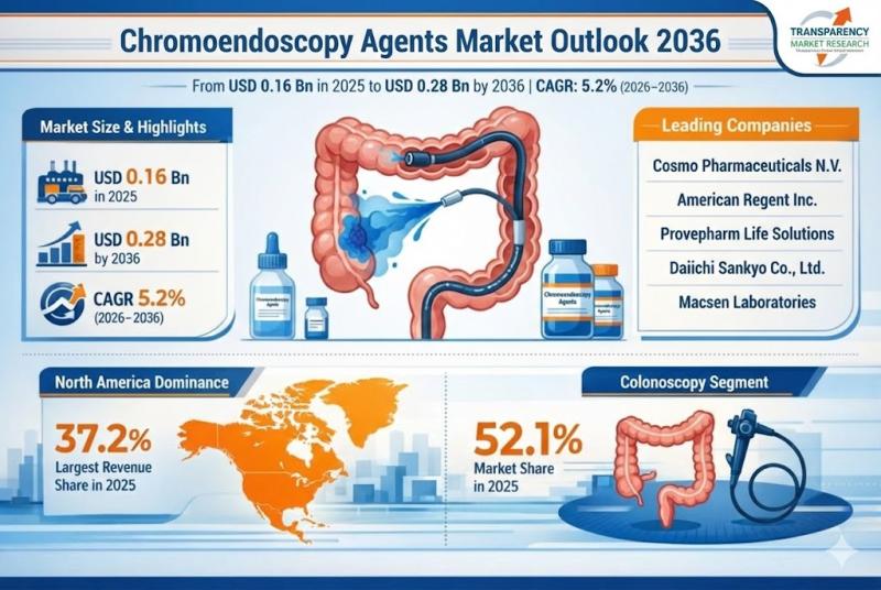 The global chromoendoscopy agents market was valued at US$ 0.16 billion in 2025 and is projected to reach US$ 0.28 billion by 2036, expanding at a CAGR of 5.2% from 2026 to 2036. The market is witnessing consistent growth due to the rising prevalence of gastrointestinal (GI) disorders, increasing demand for early cancer detection, and growing adoption of advanced endoscopic diagnostic techniques in hospitals and specialty clinics worldwide.