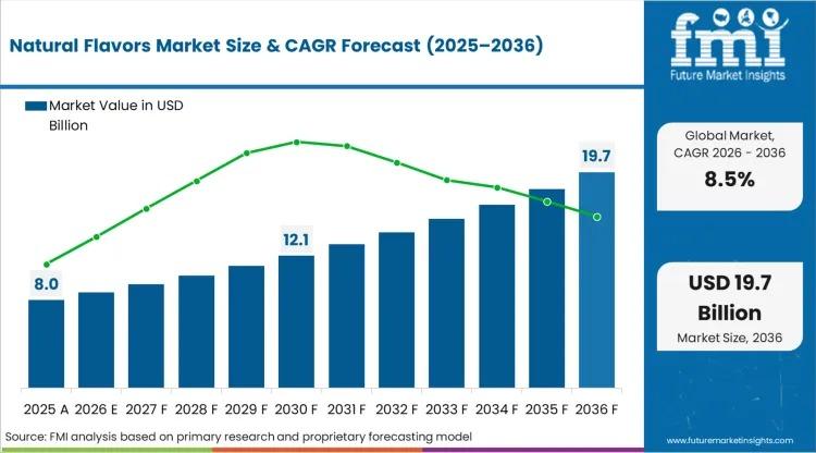 The global natural flavors market is entering a decade of structural transformation, with valuation rising from USD 8.0 billion in 2025 to USD 8.7 billion in 2026 and projected to reach USD 19.7 billion by 2036. According to analysis by Future Market Insights (FMI), the market is set to expand at a CAGR of 8.5% between 2026 and 2036, reflecting an absolute dollar opportunity of USD 11.0 billion.