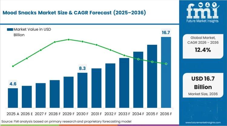 The global mood snacks market is undergoing structural transformation as consumers shift from reactive mental health treatment toward proactive daily wellbeing through functional food. Valued at USD 4.6 billion in 2025, the market is projected to reach USD 5.2 billion in 2026 and surge to USD 16.8 billion by 2036, registering a CAGR of 12.4% during the forecast period, according to analysis by Future Market Insights (FMI).