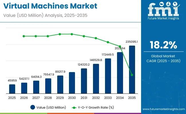The global Virtual Machines (VM) market is entering a transformative growth phase, projected to expand from USD 45,959.0 million in 2025 to USD 235,095.1 million by 2035, reflecting a robust compound annual growth rate (CAGR) of 18.2%. The acceleration underscores virtualization's central role in cloud computing, hybrid infrastructure, AI-driven workloads, and regulatory-compliant digital ecosystems.