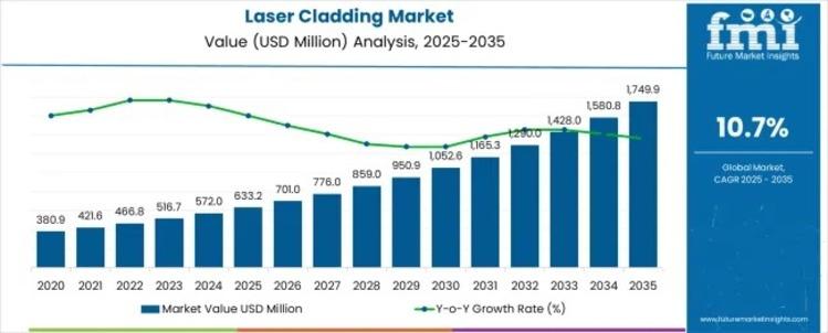 The global laser cladding market is poised for robust expansion through 2035, driven by advancements in surface engineering, industrial automation, and the push for sustainable manufacturing practices. According to Future Market Insights (FMI), the market is valued at USD 633.2 million in 2025 and is projected to reach USD 1,749.9 million by 2035, expanding at a compound annual growth rate (CAGR) of 10.7%. The FMI report, "Laser Cladding Market Size, Share, and