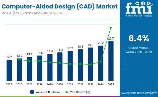 The global computer-aided design (CAD) market is poised for steady expansion, with total industry value projected to grow from USD 12.2 billion in 2025 to USD 22.7 billion by 2035, reflecting a compound annual growth rate (CAGR) of 6.4% over the forecast period. This growth is driven by accelerating adoption of digital engineering technologies across key industries including automotive, aerospace, construction, healthcare, electronics, and advanced manufacturing. CAD software has become…