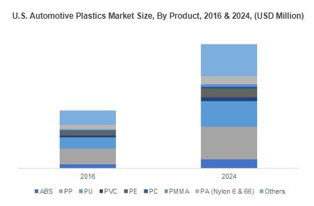 North America automotive plastics market size, with steady gains in the U.S. and Canada is poised to exceed USD 5 billion up to 2024 owing to rise in consumer preferences for lightweight and fuel-efficient vehicles. Rising OEM manufacturers demand towards reducing vehicle weight and providing cost effective solutions may have a positive influence on the regional growth. Stringent government standards and rules by CAFÉ regarding CO2 emission and fuel economy has resulted in OEMs to search for other methods to reduce vehicular weight to improve fuel efficiency.